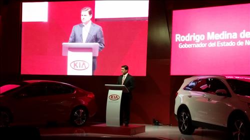 | △ 기아차가 생산공장을 짓고 있는 멕시코 누에보 레온 주의 로드리고 메디나 데 라 크루스 주지사가 9일(현지시간) 기아차 멕시코 시장 런칭 행사에서 축사를 하고 있다.(멕시코시티=연합뉴스) |