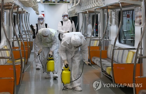 | △ 메르스 물렀거라 (고양=연합뉴스) 김도훈 기자 = 9일 오후 경기도 고양시 서울메트로지축차량기지에서 방역 관계자들이 중동호흡기중후군(메르스) 예방 대책의 하나로 살균소독 및 방역작업을 하고 있다. superdoo82@yna.co.kr |