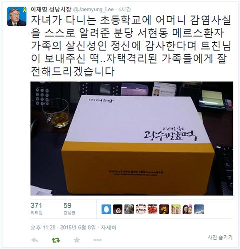 분당구 서현동에 거주하는 메르스 확진 환자 가족에게 보내달라며 이 시장의 트위터 친구가 보낸 떡이었다.