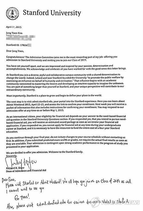 | △ 하버드·스탠퍼드대 "한국 여고생 합격 사실 아니다" (워싱턴=연합뉴스) 노효동 특파원 = 미국의 명문 하버드 대학과 스탠퍼드 대학에 동시 진학했다는 미국 유학 여고생 김정윤(18)양의 주장에 대해 스탠퍼드대학측은 합격사실을 부인했다. "대학의 공식 담당자가 그런 문서를 발행한 적이 없다"고 답변했다. 스탠퍼드대학측은 특히 김양 가족이 언론에 보여준 합격통지서에 대해 "대학의 공식 담당자가 그런 문서를 발행한 적이 없다"고 밝혔다. (김정윤양 가족 제공) |