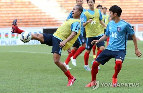 | △ (샤알람<말레이시아>=연합뉴스) 전수영 기자 = 아랍에미리트(UAE)와의 평가전을 앞두고 9일 오후 말레이시아 샤알람의 샤알람스타디움에서 첫 훈련에 나선 강수일(가운데) 등 선수들이 전술훈련을 하고 있다. 2015.6.9 swimer@yna.co.kr |