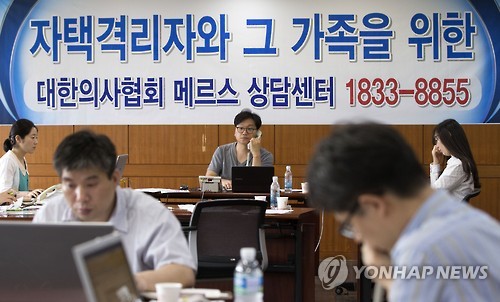 | △ 대한의사협회, 메르스 대응센터 운영 (서울=연합뉴스) 윤동진 기자 = 중동호흡기증후군(메르스)이 확산돼고 있는 9일 오후 서울 용산구 '대한의사협회 메르스 대응센터'에서 자택격리자와 가족을 위한 전문상담사들이 업무를 보고 있다. |