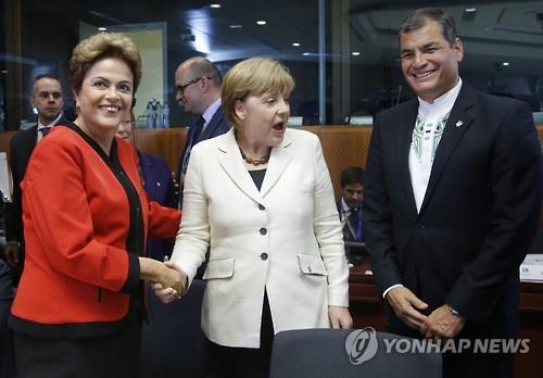 | △ EU-CELAC 정상회의에 참석한 호세프 대통령(왼쪽)과 메르켈 총리(가운데).(EPA=연합뉴스) |