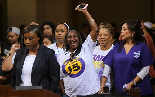 (로스앤젤레스=연합뉴스) 김종우 특파원 = 미국 LA 시의회가 10일(현지시간) 2020년까지 시간당 최저임금을 차례로 15달러(1만6천600원)까지 인상하는 `최저임금 인상 조례안'을 최종 승인했다.