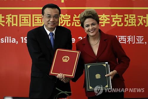 | △ 5월 중순 브라질을 방문한 리커창 중국 총리(왼쪽)가 지우마 호세프 브라질 대통령과 만나 대규모 투자협정을 체결했다.(EPA=연합뉴스 자료사진) |