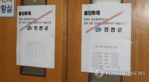 | △ 출입통제한 진천군청 (진천=연합뉴스) 변우열 기자 = 충북 진천군은 10일 중동호흡기증후군(메르스) 의심 증세를 보이는 공무원이 근무한 부서 직원들을 모두 격리조치하고 해당 사무실의 출입을 통제하고 있다. |