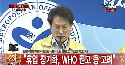 조 교육감은 지난 7일 강남·서초구의 유치원과 초등학교에 사흘간 일괄 휴업 명령을 내렸다. 이어 10일에는 일괄 휴업 조치를 12일까지로 연장했고 강동·송파·강서·양천구에 있는 학교들에도 휴업을 강력히 권고했다.