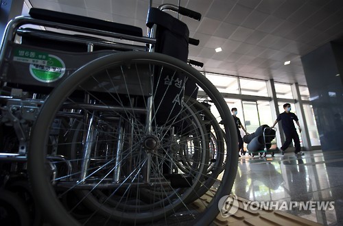 | △ 14번 환자 휠체어로 응급실 밖 이동 (서울=연합뉴스) 홍해인 기자 = 60명을 감염시키며 중동호흡기증후군(메르스) '슈퍼전파자'로 알려진 14번 환자가 삼성서울병원에서 휠체어로 응급실 밖으로도 이동한 것으로 확인된 12일 서울 일원동 삼성서울병원 로비의 휠체어 보관소 앞으로 직원들이 오가고 있다. hihong@yna.co.kr |