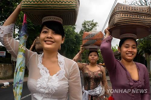 | △ (자료사진) 국제적인 관광지 인도네시아 발리 섬의 현지 여인들이 제단에 바칠 제물을 머리에 이고 사원으로 가고 있다. |