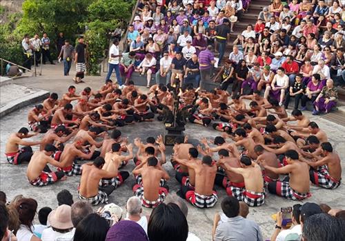 | △ (자카르타=연합뉴스) 신성철 통신원 = 인도네시아 발리 전통 께짝 춤을 관광객들이 관람하고 있다. [자료사진] |