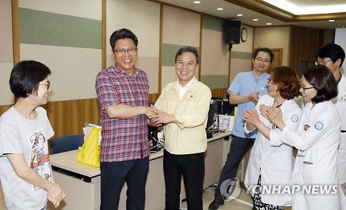 | △ 기뻐하는 전주예수병원 의료진과 직원들 (전주=연합뉴스) 김진방 기자 = 중동호흡기증후군(MERS·메르스) 의심 증상으로 보이는 고열 증상이 있었던 전주 예수병원 수련의에 대한 3차 검사 결과가 '음성'으로 나왔다. 13일 전북도 보건당국에 따르면 이 수련의는 지난 10일 확진 판정을 받은 전주 확진 환자 A(63)씨와 접촉했던 의심 환자로 지난 10일 고열 증상을 보여 세 차례 검사를 받았고 모두 음성 판정을 받았다. 사진은 음성 판정 소식에 기뻐하는 권영창 전주예수병원장(왼쪽 두번째)과 직원들. 2015.6.13 chinakim@yna..co.kr |