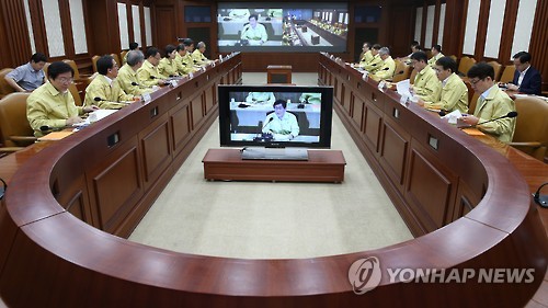 | △ 메르스 대책회의 된 경제관계장관회의 (서울=연합뉴스) 황광모 기자 = 지난 10일 오전 서울 세종로 정부서울청사에서 열린 경제관계장관회의에 참석한 관계 부처 장·차관들이 화상을 통해 중계되는 최경환 경제부총리 겸 기획재정부 장관의 중동호흡기증후군(메르스) 종식에 관한 발언을 듣고 있다. 이날 회의는 서울과 세종 청사간 화상으로 진행됐다. 2015.6.10 hkmpooh@yna.co.kr |