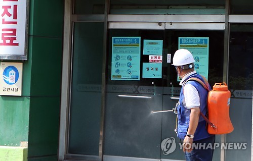 | △ 임시 폐쇄 창원SK병원 소독 작업 (창원=연합뉴스) 최병길 기자 = 70대 여성 중동호흡기증후군(메르스) 확진 환자가 5일간 입원해 지난 11일부터 오는 24일까지 임시 폐쇄 조치된 경남 창원SK병원 출입구에서 12일 창원보건소 방역팀이 소독작업을 하고 있다. 2015.6.12 choi21@yna.co.kr |