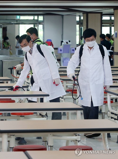 | △ 메르스 확산 방지 위한 학교 구내식당 소독 (수원=연합뉴스) 신영근 기자 = 14일 오전 경기도 중동호흡기증후군(메르스) 중점 치료센터로 지정된 수원시 장안구 경기도의료원 수원병원 인근 학교 구내식당에서 염태영 수원시장 등 수원시청 공무원들이 정상 수업 재개를 앞두고 메르스 확산을 막기 위한 소독작업을 벌이고 있다. 2015.6.14 drops@yna.co.kr http://blog.yonhapnews.co.kr/geenang |