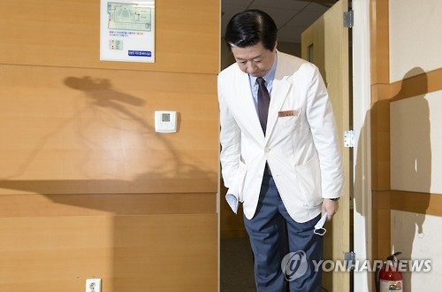 | △ 인사하는 송재훈 병원장 (서울=연합뉴스) 윤동진 기자 = 송재훈 삼성서울병원 병원장이 14일 오전 서울 강남구 서울삼성병원 암병원에서 열린 기자회견장에 들어서며 인사를 하고 있다. 송 원장은 이날 기자회견에서 "이날부터 신규 외래·입원 환자를 한시적으로 제한하며 응급수술을 제외하고는 수술과 응급진료도 한시 중단한다"고 밝혔다. 2015.6.14 mon@yna.co.kr |