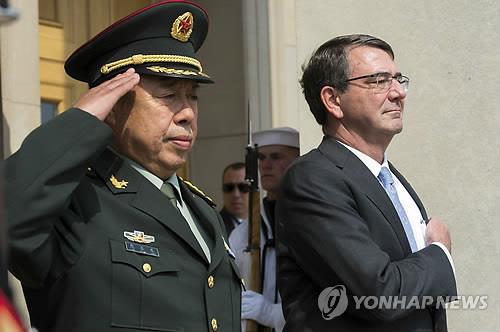 | △ (알링턴 EPA=연합뉴스) 판창룽 중국 중앙군사위원회 부주석(왼쪽)이 11일(현지시간) 미국 버지니아주 알링턴 국방부 청사에서 열린 환영식에서 애슈턴 카터 국방장관과 국가를 경청하고 있다. 이날 중국군 고위방문단은 카터 장관과 남중국해 인공섬 문제 등 미·중 간 현안에 대해 의견을 나눴다. |
