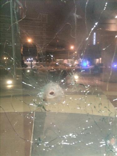 | △ 13일(현지시간) 새벽 총격범이 쏜 총알이 텍사스 주 댈러스의 경찰본부 정문 유리창을 관통한 모습. 댈러스 경찰이 사건 직후 관련 사진을 트위터에 올렸다. 2015.6.14 |