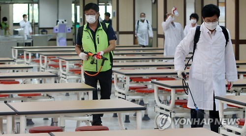 | △ 메르스 확산 방지 위한 학교 구내식당 소독 (수원=연합뉴스) 신영근 기자 = 14일 오전 경기도 중동호흡기증후군(메르스) 중점 치료센터로 지정된 수원시 장안구 경기도의료원 수원병원 인근 학교 구내식당에서 염태영 수원시장 등 수원시청 공무원들이 정상 수업 재개를 앞두고 메르스 확산을 막기 위한 소독작업을 벌이고 있다. 2015.6.14 drops@yna.co.kr http://blog.yonhapnews.co.kr/geenang |