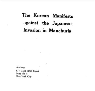 미국 뉴욕 맨해튼에 소재한 뉴욕한인교회의 역사편찬위원회는 '일본의 만주침략에 반대하는 한국인 성명서'(The Korean Manifesto against the Japanese Invasion in Manchuria)라는 제목의 문서를 교회 창고에서 최근 발견했다.