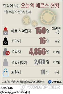 (서울=연합뉴스) 김태균 기자 = 중동호흡기증후군(메르스) 확진자가 5명 늘어 메르스 환자가 모두 150명으로 집계됐다고 보건복지부가 15일 밝혔다.