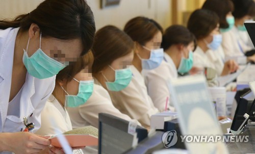 | △ 마스크 쓴 병원 직원들 (서울=연합뉴스) 김도훈 기자 = 8일 오후 서울 광진구 건국대병원에서 병원 관계자들이 마스크를 쓰고 업무를 보고 있다. 중앙메르스대책본부는 건국대병원에 입원 중 중동호흡기증후군(메르스) 확진 판정을 받은 76번 환자와 관련, 건국대 병원에 오기 전 거친 강동경희대병원의 239명과 건국대병원의 147명을 각각 이 환자와의 밀접접촉자로 보고 격리 관찰 중이라고 밝혔다. 2015.6.8 superdoo82@yna.co.kr |
