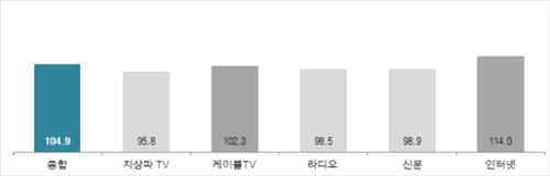 코바코가 조사한 7월의 '광고경기 예측지수'(KAI)는 104.9로, 주요 매체인 지상파TV(95.8)와 라디오(98.5), 신문(98.9)은 100보다 낮은데 비해 케이블TV(102.3)와 인터넷(114.0)은 100보다 높았다.