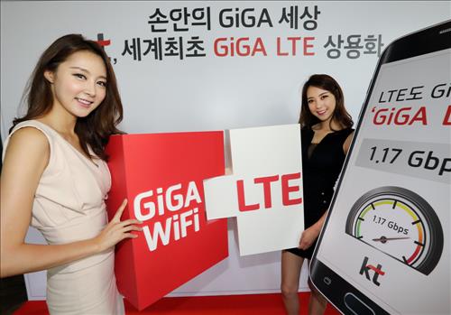 KT는 15일 서울 광화문 올레스퀘어에서 기가 LTE 서비스 시연회를 열어 기존 LTE보다 15배, 3밴드 LTE-A보다 4배 빠른 최대 1.17Gbps의 속도를 낼 수 있는 기가 LTE 서비스를 세계 최초로 상용화해 5세대(5G) 이동통신 시대 실현을 위한 교두보를 확보했다고 밝혔다.