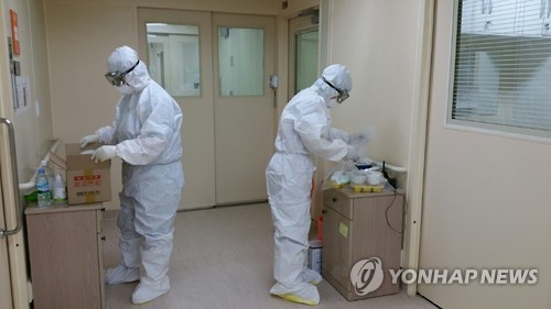 | △ 강릉의료원 메르스 확진 환자 치료 안간힘 (춘천=연합뉴스) 임보연 기자 = 강원도 내에서 유일하게 국가지정 격리 병상을 보유한 강릉의료원이 중동호흡기증후군(메르스) 확진 환자 치료에 안간힘을 쏟고 있다. 12일 현재 의사 1명과 간호사 4명 등 5명의 의료진이 지난 9일부터 격리병동에 상주한 채 확진 환자 2명과 의심환자 1명 등 3명을 치료하면서 거의 감옥같은 생활을 이어가면서도 공공의료기관 및 국가지정 격리병원으로서의 역할을 충실하게 수행하고 있다.사진은 의료진이 격리병동 내에서 보호복을 착용한채 진료활동을 하는 모습. 2015.6.12 <<강원도>> limbo@yna.co.kr |