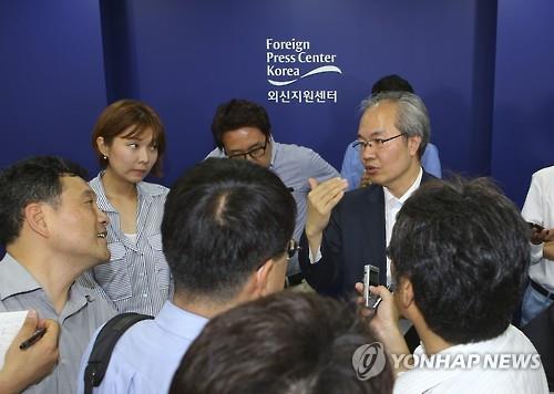 | △ 15일 서울 중구 프레스센터에서 열린 '정부외신기자 대상 중동호흡기증후군(메르스) 브리핑'이 끝난 직후 외신 기자들이 권준욱 보건복지부 공공보건정책관 주위에 질문하기위해 모여 있다. 2015.6.15 |