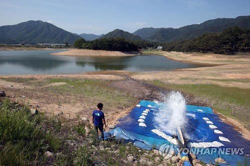 | △ 바닥 드러낸 저수지에 댐 물 투입 (춘천=연합뉴스) 이상학 기자 = 최근 극심한 가뭄으로 농가마다 어려움을 겪는 가운데 강원 춘천시 신북읍 조연저수지에 인근 소양강댐 물을 끌어올려 채우고 있어 눈길을 끌고 있다. 2015.6.11 hak@yna.co.kr |