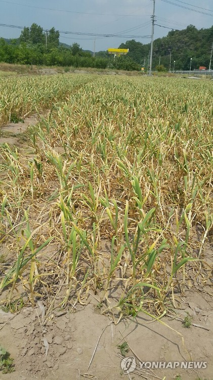 | △ 바싹 마른 마늘밭 (의성=연합뉴스) 이강일 기자 = 계속된 가뭄으로 경북 의성군 단촌면 세촌리의 한 마늘밭이 물기라고는 찾아볼 수 없을 정도로 바짝 말랐다. 2015.6.16 leeki@yna.co.kr |