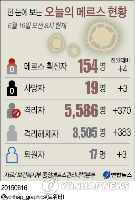 16일 보건복지부 중앙메르스관리대책본부는 기존 확진자 가운데 38번 환자(49), 98번 환자(58), 123번 환자(65)가 15일과 16일 중 사망해 전체 사망자가 19명으로 늘었다고 밝혔다.