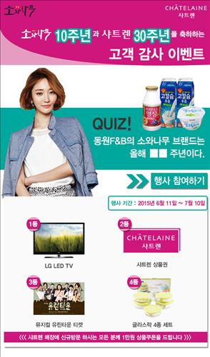 7월10일까지 소와 나무 홈페이지(www.dwdf.co.kr)에서 행사에 응모하는 고객에게는 추첨을 통해 LG LED 텔레비전(1명)과 20만원 상당의 샤트렌 상품권(5명), 뮤지컬 유린타운 초대권 2매(20명) 등을 증정한다.