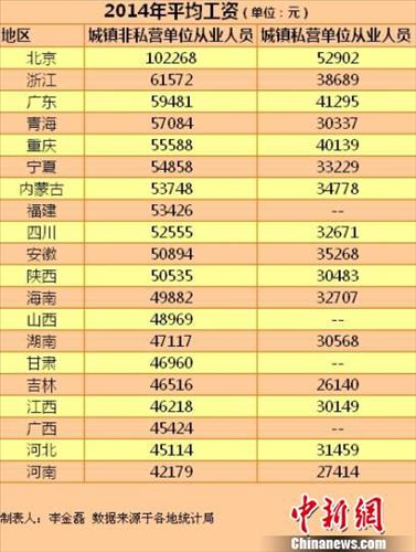 16일 중국신문망에 따르면 중국에서 현재 20개성이 2014년 평균연봉을 발표한 가운데 베이징이 공공부문과 민간부문에서 각각 10만2천268위안(1천800만원), 5만2천902위안을 기록, 수위를 차지했다.