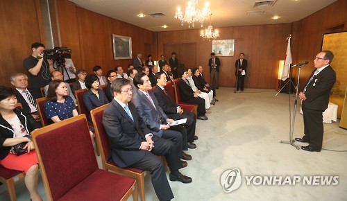 | △ 욱일쌍광장 받은 이수현씨 부친 (부산=연합뉴스) 김선호 기자 = 16일 오전 11시 30분 부산 수영구 주부산일본국총영사 관저에서 의인인 고 이수현씨 아버지인 이성대 LSH 아시아장학회 명예회장이 일본 정부의 훈장인 '욱일쌍광장'을 받은 뒤 소감을 말하고 있다. 2015.6.16 wink@yna.co.kr |