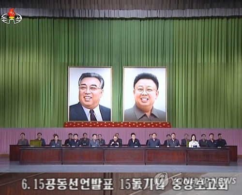 | △ 사진은 북한조선중앙TV가 15일 정부성명 발표 후 방영한 '6·15 남북공동선언 발표 15주년 기념 중앙보고회'의 한 장면이다. 2015.6.16.<<연합뉴스DB>> |