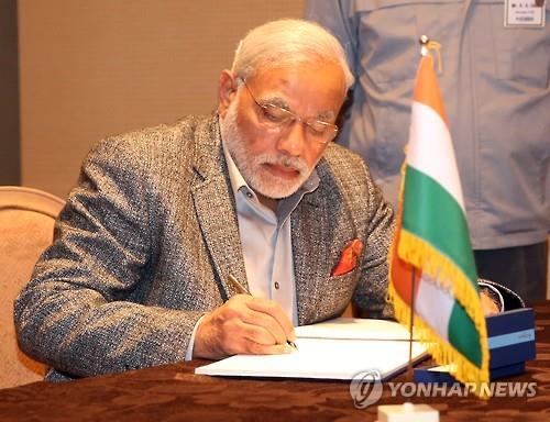 | △ '현대중공업 방문' 방명록 작성하는 인도 총리 지난달 19일 울산시 동구 현대중공업 본사를 방문한 나렌드라 모디 인도 총리가 면담을 끝내고 방명록을 작성하고 있다. (연합뉴스DB) |