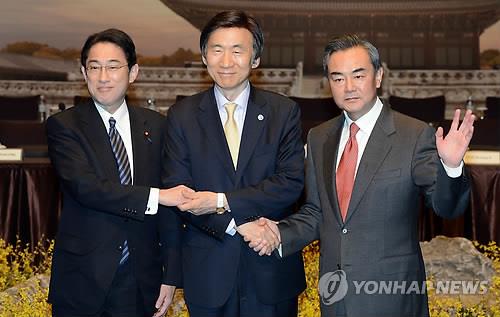 | △ 2015년 3월 21일 서울 중구 신라호텔에서 열린 제7차 한중일 3국 외교장관회의에서 윤병세 외교부 장관(가운데), 왕이 중국 외교부장(오른쪽), 기시다 후미오 일본 외무상이 회의 시작전 기념촬영을 하고 있다.(사진공동취재단 = 연합뉴스 자료사진) |