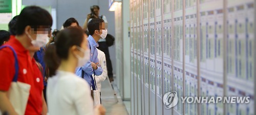 | △ 채용박람회를 찾은 시민들이 마스크를 쓰고 채용게시판을 살펴보고 있다. |