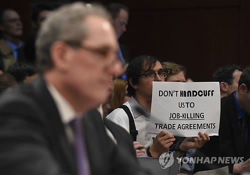 | △ (AP=연합뉴스) 27일(현지시간) 미국 워싱턴의 의회 하원 세입위원회 청문회에서 마이클 프로먼 미무역대표부(USTR) 대표(왼쪽)가 환태평양경제동반자협정(TPP) 협상 등과 관련 증언하고 있다. 그 뒤에서 한 방청객이 일자리를 빼앗길 수 있다는 우려를 나타내는 문구의 종이를 들어 보이고 있다. |