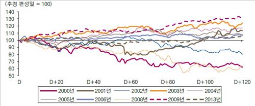 | △ **추경 편성일의 지수를 100으로 볼 때 80일, 100일, 120일 등 뒤의 지수 등락률을 표시. 삼성증권 제공. |