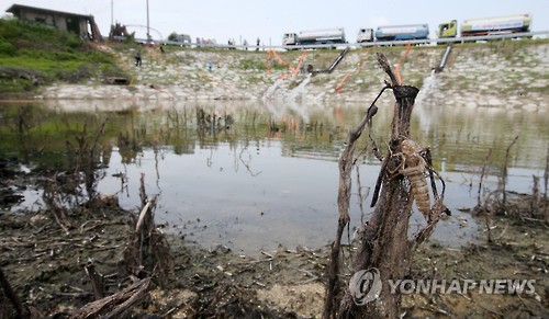 | △ 남한강 물로 마른 저수지 물 채우기 (여주=연합뉴스) 신영근 기자 = 극심한 가뭄이 계속되는 가운데 18일 오전 경기도 여주시 대신면 옥촌저수지에서 수자원공사가 남한강 물을 담은 물탱크 차량으로 바닥을 드러낸 저수지에 물을 채우고 있다. 2015.6.18 drops@yna.co.kr http://blog.yonhapnews.co.kr/geenang |