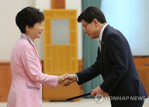 | △ 박 대통령, 황교안 총리에 임명장 수여 (서울=연합뉴스) 백승렬 기자 = 박근혜 대통령이 18일 오후 청와대에서 황교안 국무총리에게 임명장을 수여하고 있다. |