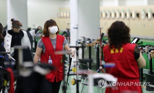 | △ 사격장에도 메르스 여파 (대구=연합뉴스) 김준범 기자 = 18일 대구종합사격장에서 열린 제31회 대한사격연맹 회장기 전국사격대회 10m 공기소총 여자 대학부 경기 감독관들이 마스크를 쓰고 지켜보고 있다. 2015.6.18 psykims@yna.co.kr |