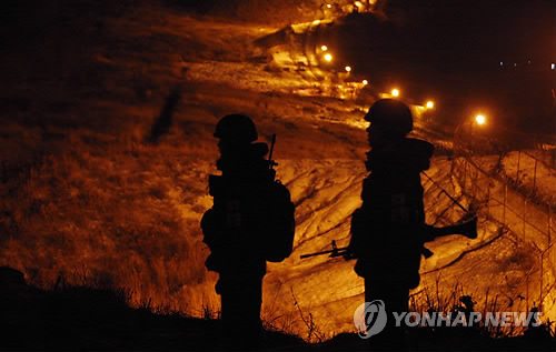| △ 저물어 가는 휴전선의 밤 (철원=연합뉴스) 이해용 기자 = 연말을 맞아 강원 철원군 중부전선에서 육군 6사단 병사가 순찰로를 이동하고 있다. 2014.12.25 dmz@yna.co.kr |