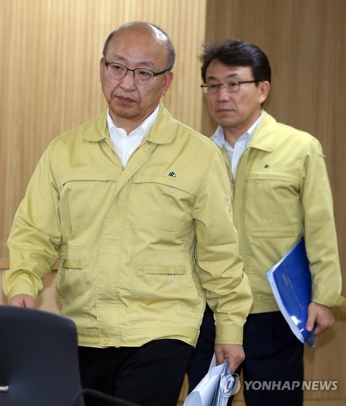 | △ 문형표 보건복지장관과 권덕철 중앙메르스관리대책본부 총괄반장 (세종=연합뉴스) 배재만 기자 = 문형표 보건복지부 장관과 권덕철 중앙메르스관리대책본부 총괄반장이 18일 오후 정부세종청사 공용영상회의실에서 서울청사와 영상으로 열린 중동호흡기증후군(메르스) 관련 범정부 대책회의에 참석하기 위해 입장하고 있다. 2015.6.18 scoop@yna.co.kr http://blog.yonhapnews.co.kr/f6464 |