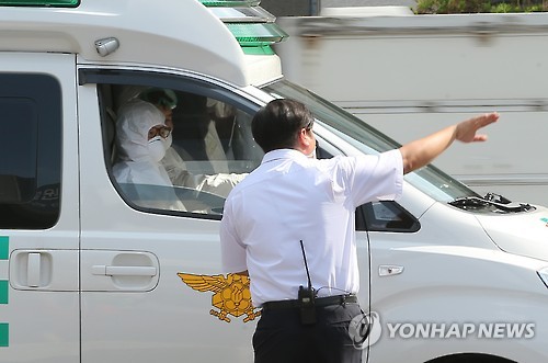 | △ 지방에서 후송되는 메르스 확진환자 (서울=연합뉴스) 황광모 기자 = 18일 오후 서울 을지로 국립중앙의료원에 중동호흡기증후군(메르스) 환자가 119 구급대 구급차를 통해 이송되고 있다. |
