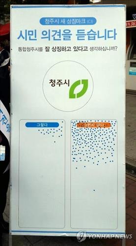 | △ (청주=연합뉴스) 김형우 기자 = 새정치민주연합 소속 청주시의원들은 지난 10일 오후 청주 성안길 일원에서 청주시 새 상징마크(CI)에 대한 시민의견을 조사했다. 사진은 당시 시민의견을 받은 팻말. <<연합뉴스 DB>> |