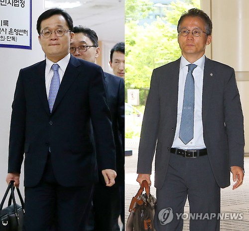 | △ 삼성물산-엘리엇 법정 공방 시작 (서울=연합뉴스) 한종찬 기자 = 19일 오전 서울 서초구 중앙지법에서 엘리엇이 삼성물산과 제일모직의 합병을 무산시키기 위해 제기한 2건의 가처분 소송에 대한 첫 심문이 열렸다. 사진은 이날 오전 법원에 출석하는 삼성물산 측 김용상 변호사(왼쪽)과 엘리엇의 법률 대리인 최영익 변호사. |