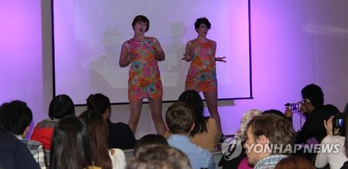 | △ (시드니=연합뉴스) 김기성 특파원 = 호주 시드니 주재 한국문화원(원장 안신영)에서 지난 17일 열린 '한국어 말하기 대회' 행사 중 K-팝 공연을 전문적으로 하는 호주의 두 여성이 실력을 뽐내고 있다. 2015.6.19 |